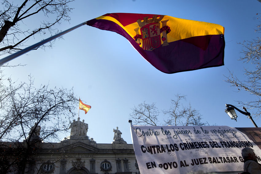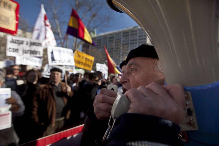 Portando pancartas con leyendas como «Contra los juicios de la vergüenza», «Contra los crímenes del franquismo», «Anular sentencias franquistas» o «Justicia universal, aquí», los participantes corearon consignas de «Vergüenza» o «Justicia».