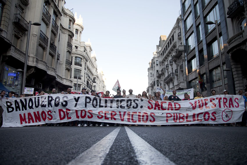 Una manifestación recorrió el pasado domingo desde las 19.00 horas el centro de Madrid desde Cibeles hasta la Puerta del Sol con el lema «Banqueros y políticos: ‘Sacad vuestras manos de los Servicios Públicos».